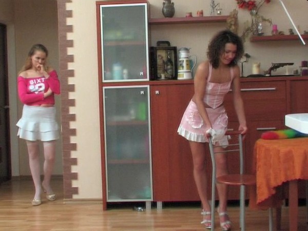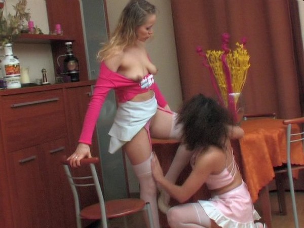 Nasty maid going for lesbian play with a babe in the same white stockings